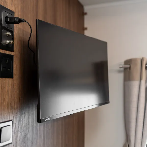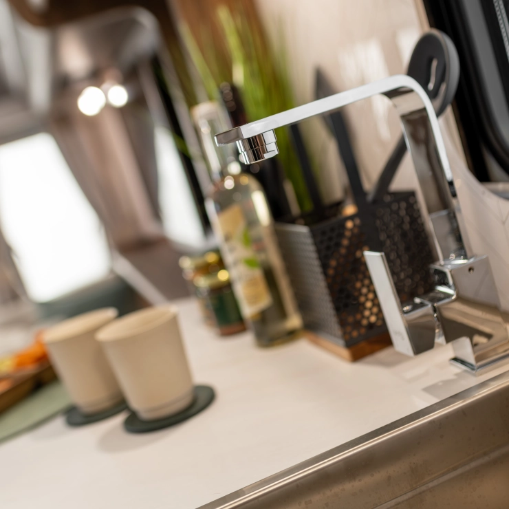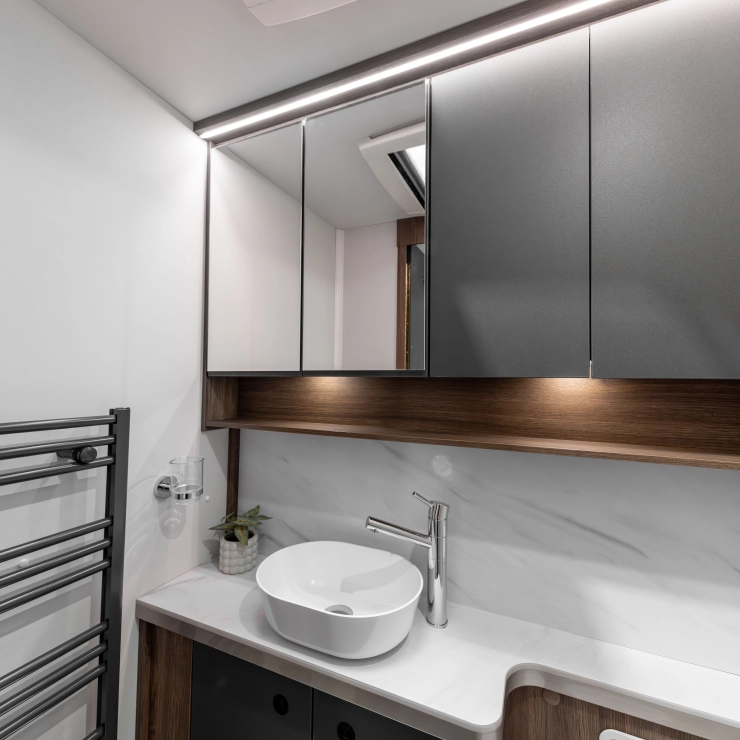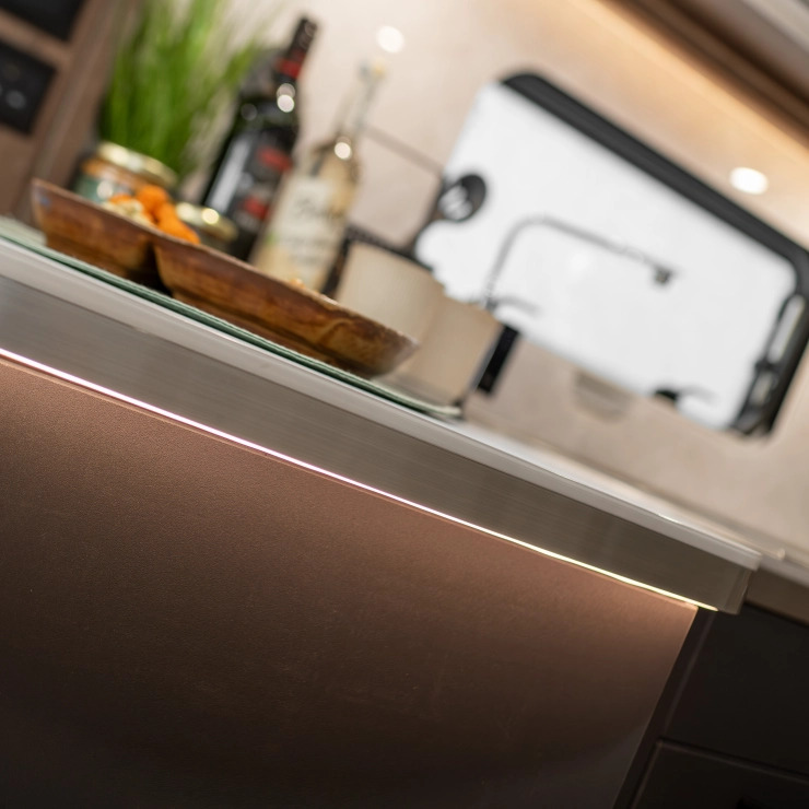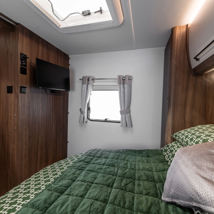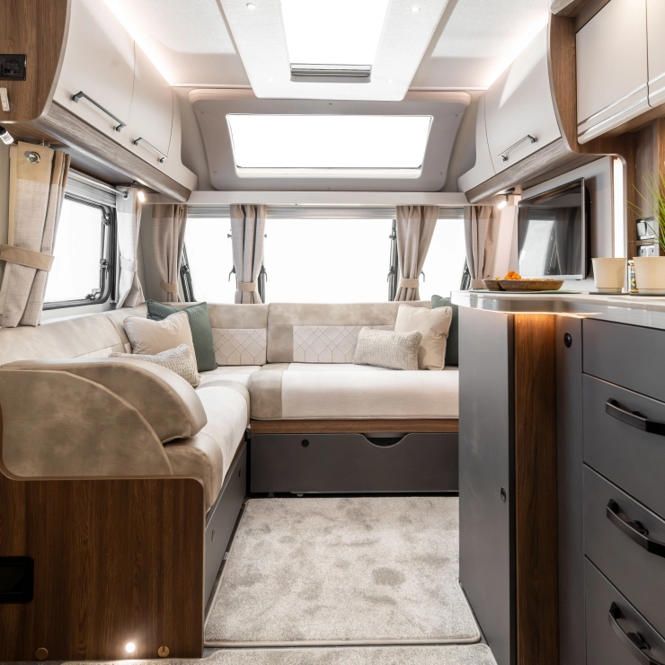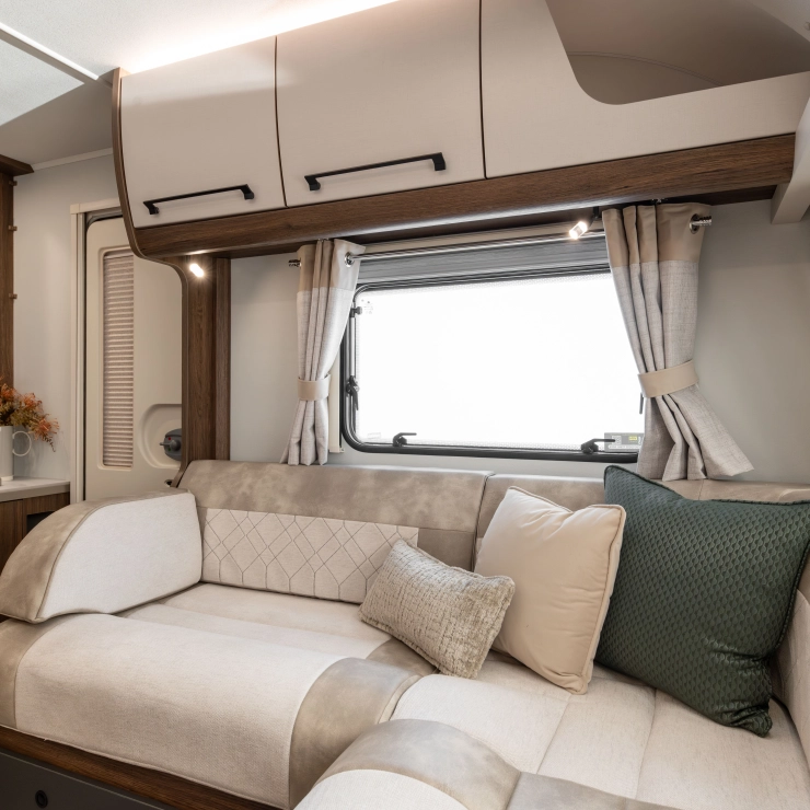 For couples who want the perfect balance of comfort and luxury, the Starliner Barracuda offers a deeply relaxing environment enhanced by thoughtful upgrades. The familiar L-shaped lounge is still at the heart of the design—perfect for morning coffee, afternoon reads, or evening films on the 32” TV.