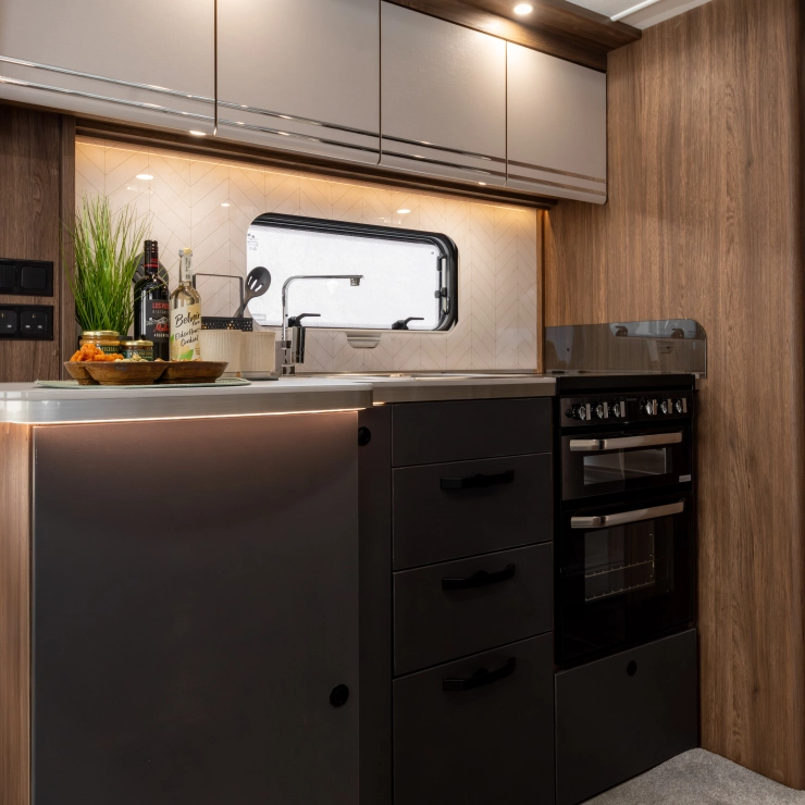 • Thetford K1520 MK2 Black Gloss Oven, grill and dual fuel hob with spark ignition and 800w electric hotplate, three gas burners with smoked glass lid, additional oven shelf and interior light and cast-iron pan stands