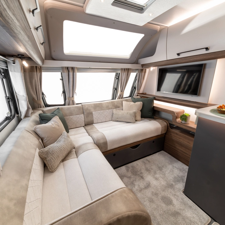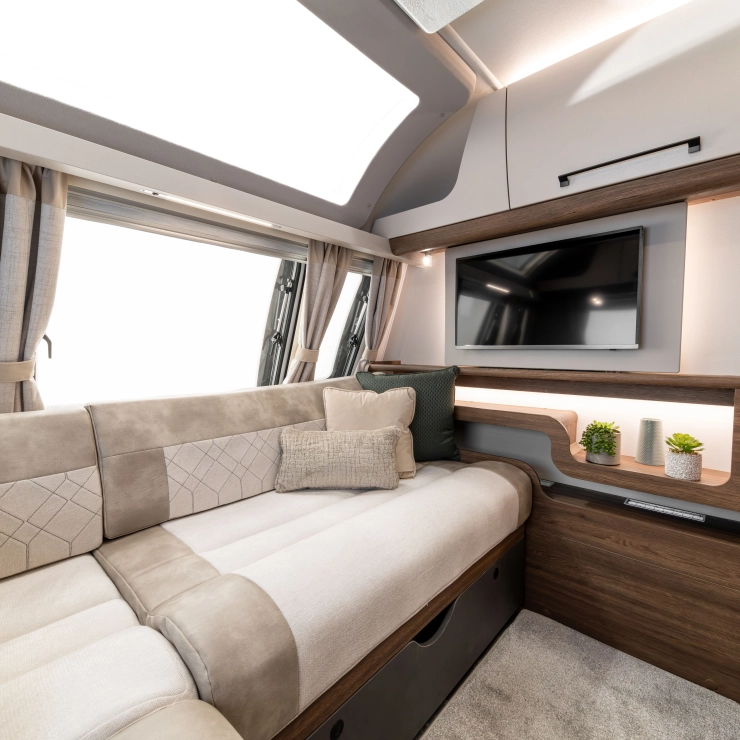 For couples who want the perfect balance of comfort and luxury, the Starliner Barracuda offers a deeply relaxing environment enhanced by thoughtful upgrades. The familiar L-shaped lounge is still at the heart of the design—perfect for morning coffee, afternoon reads, or evening films on the 32” TV.